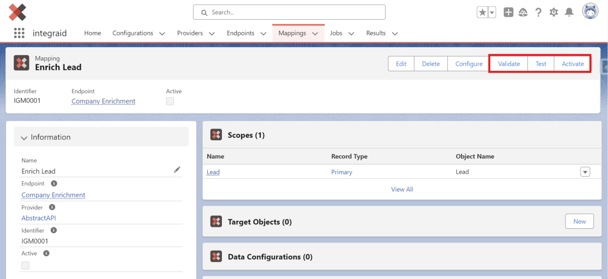 Once the mapping has been configured, you can validate it by clicking on the "Validate" button and activate it by clicking on the "Activate" button. To test it, you can click on the "Test" button.