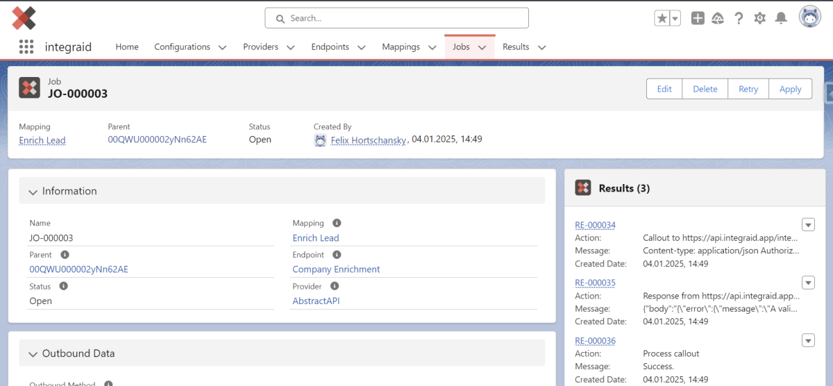 Jobs are a central component in integraid that handle every callout and every callin. They serve as a kind of log or record for every interaction with an interface and enable asynchronous processing of data. You can find all your jobs in the tab of the same name on the integraid interface.