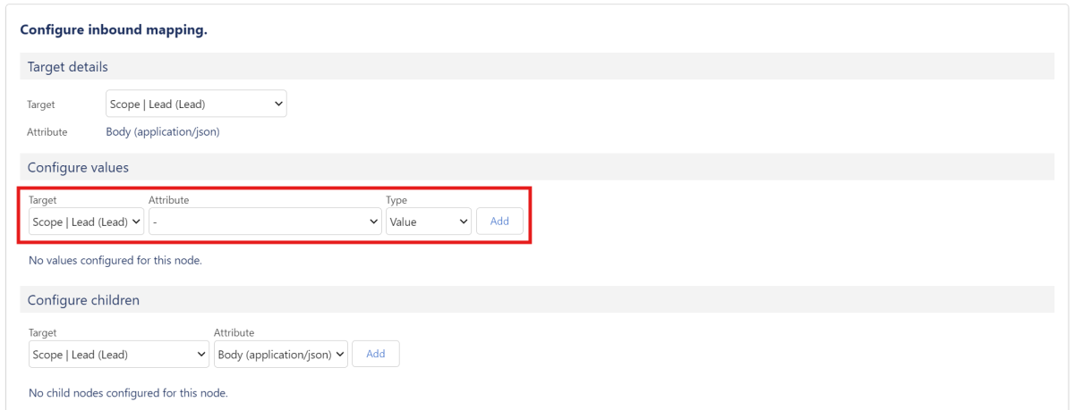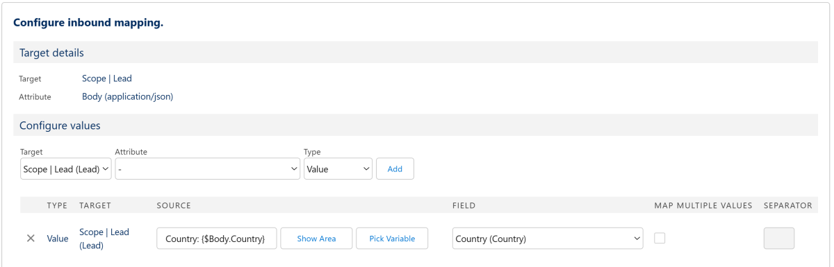 Configure inbound: Here, the fields in the lead object are assigned to the attributes of the Abstract API response. We fill in the fields we created earlier: